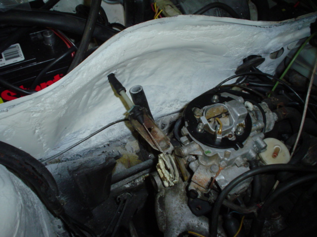 Next up was the Accelerator Cable. Because there was a diesel accel cable, there was no hole in the firewall for the gas accel cable to attach to the carb. Got out the trusty drill and lined up and drilled a hole for the accel cable to pass through and attach to the carb. Here's what it looks like all done: