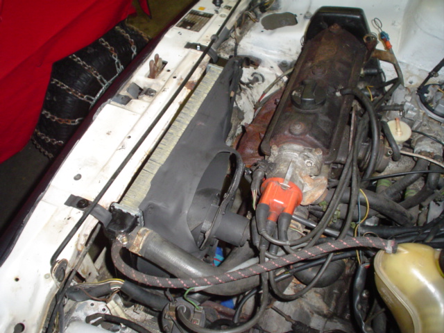 Well, the parts arrived from Euro Car parts, so I opened the box and got cracking. I started with the Radiator- had to take the old fan housing off the leaky radiator and install it on the new one. While off, I sanded and painted it so it would look better. After installing the temp sensor I fitted the radiator and installed it. Here's a pic: