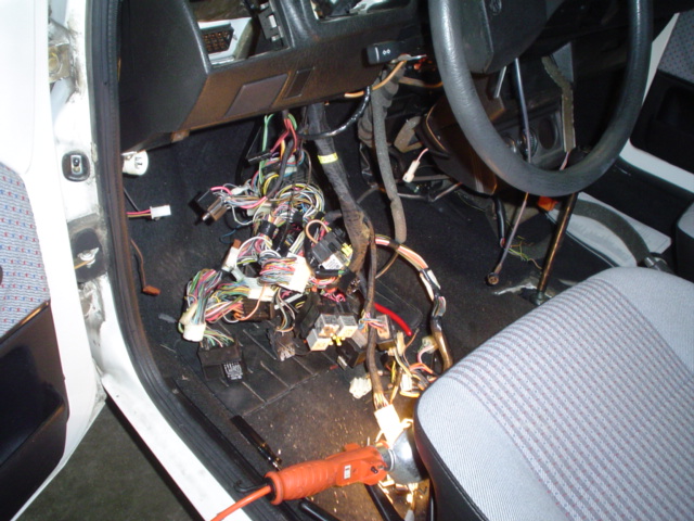 The wiring harness running throughout the interior of the car was immense compared a normal gas polo. Because the car was built as a two cylinder fuel injected diesel with G40 supercharger, there were additional guages, fuel injection computers, and many other relays and wiring related to the "Oko Polo" I had to remove this wiring and fit the interior of the car with wiring appropriate for the 1.05L Gas motor and appropriate guage cluster, etc. Pulling the old harness was a project in itself, as I wanted to preserve it in tact. I could have easily just hacked it all up and pulled it from the car, but it is one of only 70 harnesses exactly like it in the whole world, so I thought it was worth the effort.